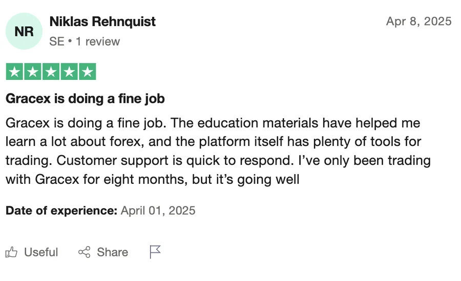 Gracex получил награды The Fastest Growing Broker 2024 (World Financial Award) и The Best Customer Support 2024 (Forex Brokers Association). В отзывах трейдеры отмечают быструю работу службы поддержки — время ответа редко превышает пару минут.
